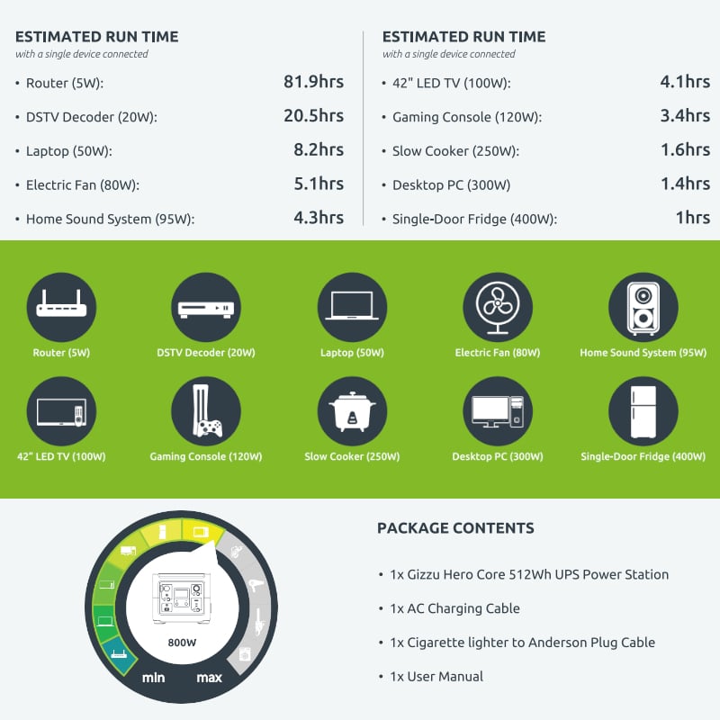 Deliver power wherever and whenever you need it with the portable Gizzu Hero Core UPS Power Station. The Hero Core offers 512Wh of battery capacity. It’s great for keeping your devices charged during outdoor adventures and powering most household appliances during loadshedding. The elegant design is durable, robust, and can be taken with you on any adventure.